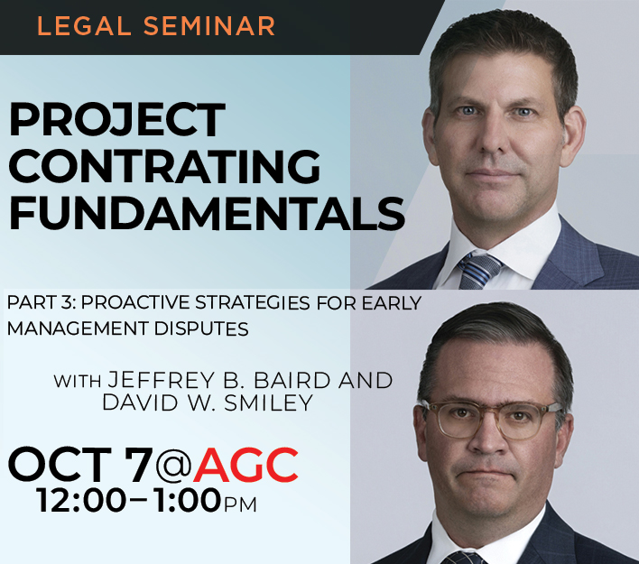 Finch, Thornton & Baird, LLP is routinely called upon to provide training and educational support to construction industry organizations, as well as individual companies. These include seminars on new legal developments, compliance and regulatory issues, risk management, and workplace conduct and sexual harassment training as required by the California Fair Employment and Housing Act. Use the Current and Archives links to toggle between upcoming and past legal seminars.